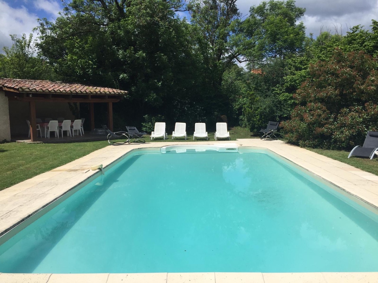 Sortez par le portail couvert de vignes, tournez à gauche et vous êtes dans le jardin de la piscine. Notre piscine mesure 9m x 5m et comporte des marches menant à la partie peu profonde. Il y a un plateau tout autour qui n'est qu'à un mètre de profondeur, donc c'est vraiment adapté aux enfants. Il y a une section profonde mais s'il vous plaît, ne plongez pas.