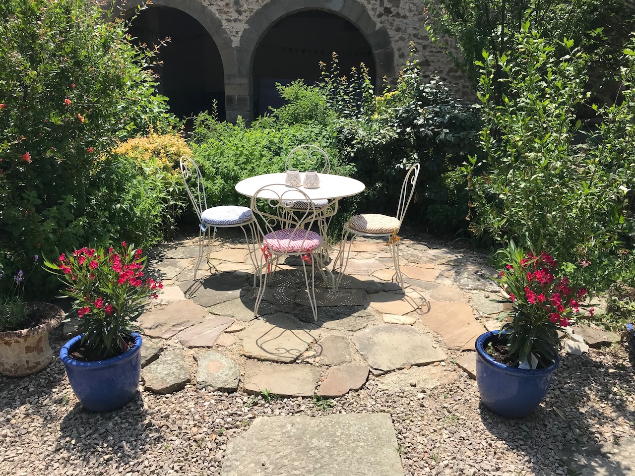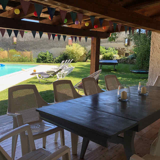 Un grand mûrier ombrage la pergola, sous laquelle se trouvent deux tables : une grande ronde pour une dizaine de personnes, et une plus petite pour six personnes. Elles se trouvent à quelques pas de la cuisine.